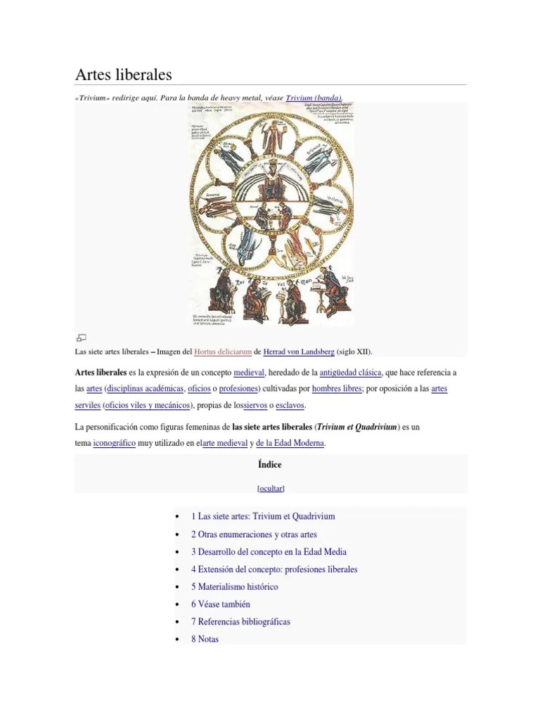 Las siete artes liberales son así miembros de un sistema de estudios que abarca las ramas de la lengua como el grado más bajo, las ramas matemáticas como el intermedio y la ciencia propiamente dicha como el grado superior y terminal... Durante la edad media se dividían las ciencias en dos partes designadas con los nombres de trivium, y quadrivium. Como contrapartes de las artes liberales se encuentran siete ciencias más elevadas: Las siete artes liberales son así miembros de un sistema de estudios que abarca las ramas de la lengua como el grado más bajo, las ramas matemáticas como el intermedio y la ciencia propiamente dicha como el grado superior y terminal. Ley civil, ley canónica, y las cinco ramas de la teología llamadas especulativa, de la sagrada escritura,. 28/08/2019 · la dialéctica estaba reducida a las definiciones de las ideas generales, sobre todo de las categorías, de las divisiones y de las explicaciones, a que se agregaba la enumeración de las formas y figuras de argumentación. 14/06/2016 · pero, como todo, siempre viene de mucho más atrás.. 14/06/2016 · pero, como todo, siempre viene de mucho más atrás.